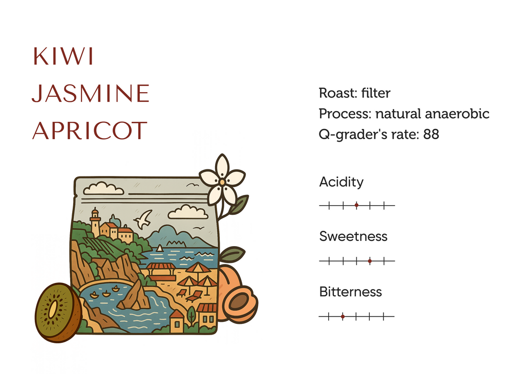 Anaerobic Colombian coffee with notes of kiwi, jasmine and apricot.