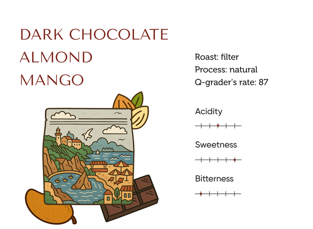 Sweet and rich coffee with notes of dark chocolate, almond, and mango.