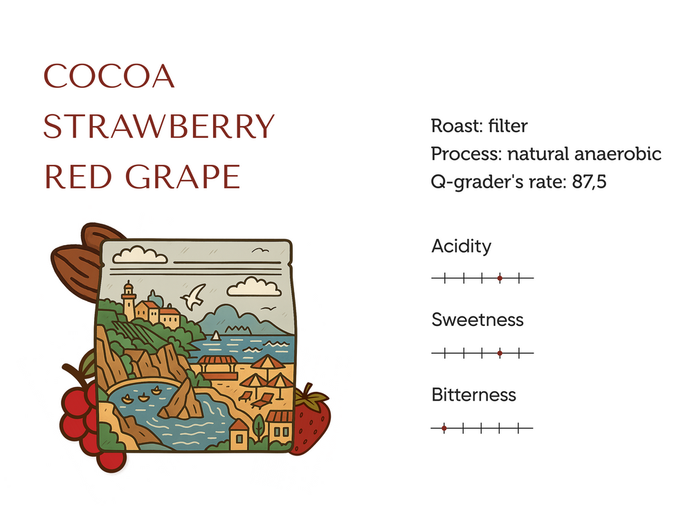 Bright fruity coffee with notes of cocoa, strawberry, and red grape.