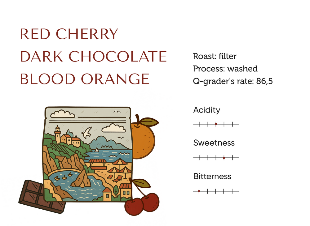 Coffee with notes of red cherry, dark chocolate, and blood orange.